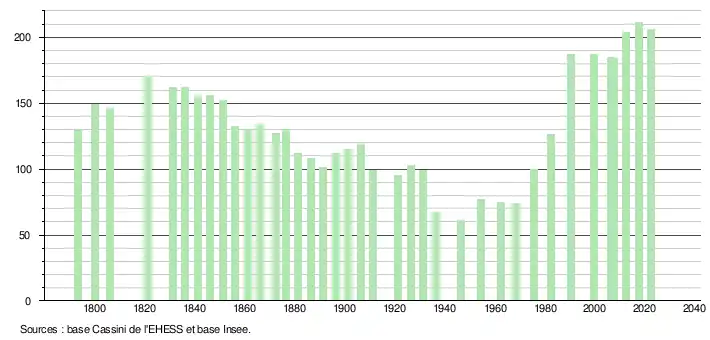 L'évolution du nombre d'habitants est connue à travers les recensements de la population effectués dans la commune depuis 1793. Pour les communes de moins de 10 000 habitants, une enquête de recensement portant sur toute la population est réalisée tous les cinq ans, les populations de référence des années intermédiaires étant quant à elles estimées par interpolation ou extrapolation[20]. Pour la commune, le premier recensement exhaustif entrant dans le cadre du nouveau dispositif a été réalisé en 2007[21].