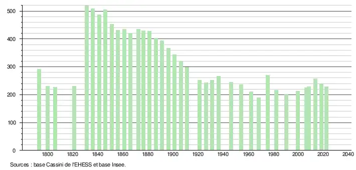 L'évolution du nombre d'habitants est connue à travers les recensements de la population effectués dans la commune depuis 1793. Pour les communes de moins de 10 000 habitants, une enquête de recensement portant sur toute la population est réalisée tous les cinq ans, les populations de référence des années intermédiaires étant quant à elles estimées par interpolation ou extrapolation[21]. Pour la commune, le premier recensement exhaustif entrant dans le cadre du nouveau dispositif a été réalisé en 2008[22].