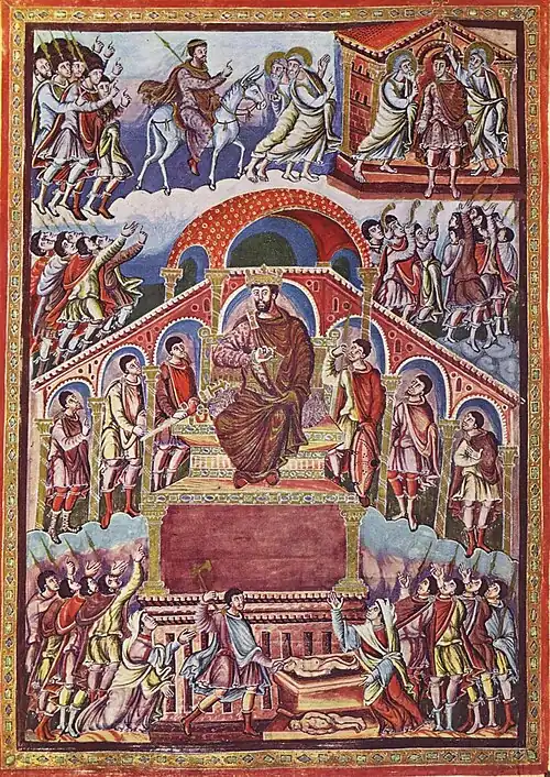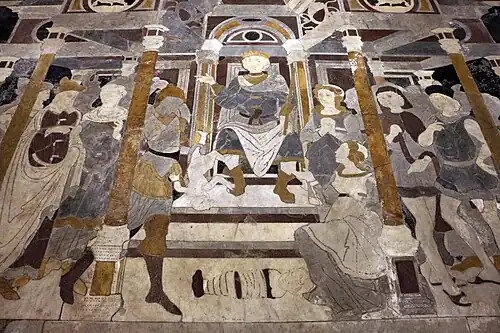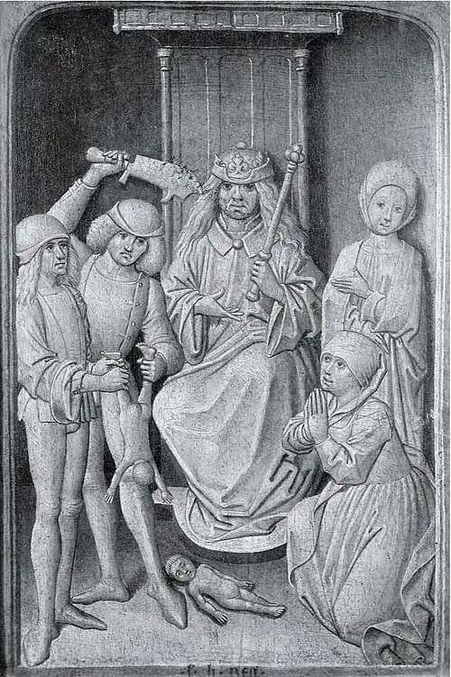 - Éléments constitutifs d'un jugement de Salomon : Salomon surélevé sur son trône, les deux mères, un soldat tenant un enfant vivant, un enfant mort déposé sur le sol et des courtisans.