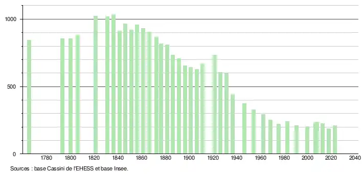 - ↑ Christiane Vidal, « Chronologie et rythmes du dépeuplement dans le département des Alpes-de-Haute-Provence depuis le début du XIXe siècle », Provence historique, t. 21, no 85, , p.287 (lire en ligne).