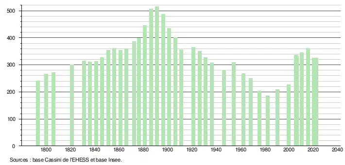 L'évolution du nombre d'habitants est connue à travers les recensements de la population effectués dans la commune depuis 1793. Pour les communes de moins de 10 000 habitants, une enquête de recensement portant sur toute la population est réalisée tous les cinq ans, les populations de référence des années intermédiaires étant quant à elles estimées par interpolation ou extrapolation[37]. Pour la commune, le premier recensement exhaustif entrant dans le cadre du nouveau dispositif a été réalisé en 2005[38].