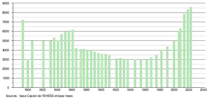 L'évolution du nombre d'habitants est connue à travers les recensements de la population effectués dans la commune depuis 1793. Pour les communes de moins de 10 000 habitants, une enquête de recensement portant sur toute la population est réalisée tous les cinq ans, les populations de référence des années intermédiaires étant quant à elles estimées par interpolation ou extrapolation[21]. Pour la commune, le premier recensement exhaustif entrant dans le cadre du nouveau dispositif a été réalisé en 2008[22].