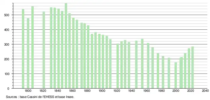 L'évolution du nombre d'habitants est connue à travers les recensements de la population effectués dans la commune depuis 1793. Pour les communes de moins de 10 000 habitants, une enquête de recensement portant sur toute la population est réalisée tous les cinq ans, les populations de référence des années intermédiaires étant quant à elles estimées par interpolation ou extrapolation[26]. Pour la commune, le premier recensement exhaustif entrant dans le cadre du nouveau dispositif a été réalisé en 2007[27].