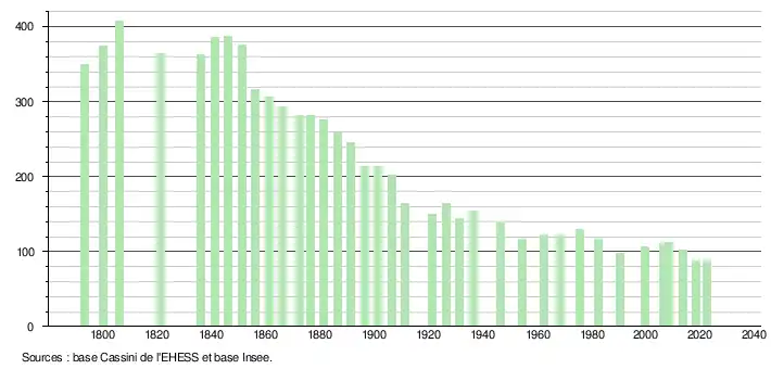 L'évolution du nombre d'habitants est connue à travers les recensements de la population effectués dans la commune depuis 1793. Pour les communes de moins de 10 000 habitants, une enquête de recensement portant sur toute la population est réalisée tous les cinq ans, les populations de référence des années intermédiaires étant quant à elles estimées par interpolation ou extrapolation[21]. Pour la commune, le premier recensement exhaustif entrant dans le cadre du nouveau dispositif a été réalisé en 2008[22].
