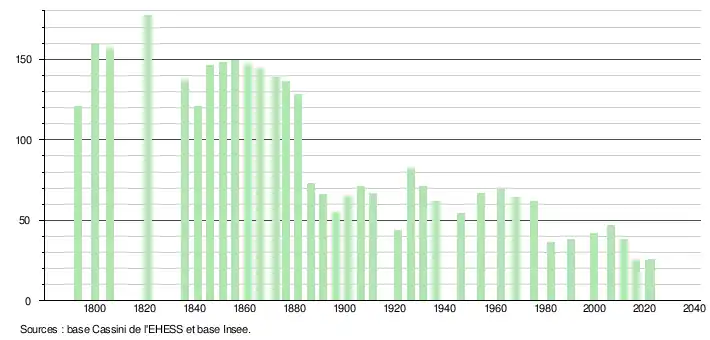 L'évolution du nombre d'habitants est connue à travers les recensements de la population effectués dans la commune depuis 1793. Pour les communes de moins de 10 000 habitants, une enquête de recensement portant sur toute la population est réalisée tous les cinq ans, les populations de référence des années intermédiaires étant quant à elles estimées par interpolation ou extrapolation[22]. Pour la commune, le premier recensement exhaustif entrant dans le cadre du nouveau dispositif a été réalisé en 2006[23].