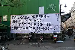 - ↑ Selon Ambre Viaud, « L'association MUR est un projet collectif qui propose à plusieurs artistes d'exposer successivement leur travail. Régulièrement, un artiste affiche son œuvre sur un grand panneau à l'angle de la rue Oberkampf et de la rue Saint Maur à Paris. Chaque nouvel artiste est lié aux autres, chaque nouvelle affiche recouvrant la précédente. » ; cf. Ambre Viaud, Street Art, Un musée à ciel ouvert, édition Palette, coll. L'Art & La Manière, 2011, p. 6 (ISBN 2358320846) ; cet ouvrage comporte 31 pages, avec de nombreuses illustrations en couleur, cf. notice BNF FRBNF42519702.[réf. à confirmer]