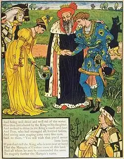 Un jour, sachant que le roi et sa fille voyagent le long de la rivière, le Chat persuade son maître de retirer ses vêtements et d'entrer dans la rivière. Il cache les habits de son maître derrière un rocher, puis appelle à l'aide. Lorsque le roi arrive, le Chat explique que son maître, le « marquis de Carabas » s'est fait dépouiller de ses habits alors qu'il se baignait dans la rivière. Le roi offre de riches vêtements au jeune homme et l'invite à s'asseoir dans son carrosse aux côtés de sa fille qui tombe instantanément amoureuse de lui.