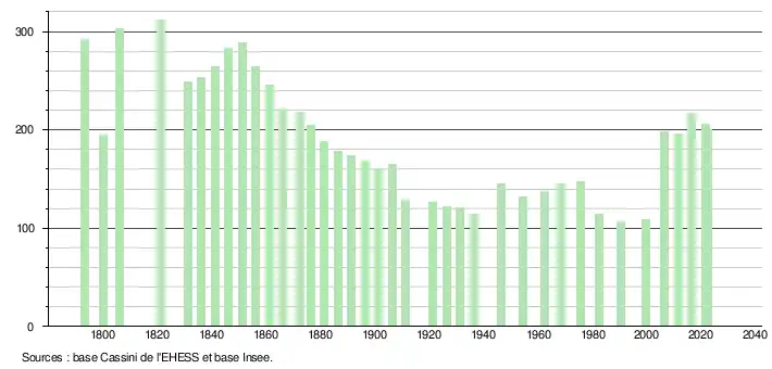 L'évolution du nombre d'habitants est connue à travers les recensements de la population effectués dans la commune depuis 1793. Pour les communes de moins de 10 000 habitants, une enquête de recensement portant sur toute la population est réalisée tous les cinq ans, les populations de référence des années intermédiaires étant quant à elles estimées par interpolation ou extrapolation[23]. Pour la commune, le premier recensement exhaustif entrant dans le cadre du nouveau dispositif a été réalisé en 2006[24].