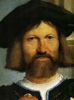 Un ange et le commanditaire Bonghi assistent à la scène, dont Lotto a réalisé un portrait frontal pénétrant, avec un usage expressif des mains. C’est un hommage de l’artiste à l’homme afin de personnaliser et embellir l’œuvre, et non un autoportrait de Lotto lui-même, comme il fut longtemps supposé.