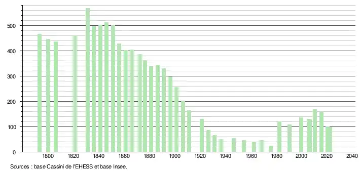 - ↑ Fiches Insee - Populations de référence de la commune pour les années 2006, 2007, 2008, 2009, 2010, 2011, 2012, 2013, 2014, 2015, 2016, 2017, 2018, 2019, 2020, 2021 et 2022.