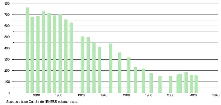 L'évolution du nombre d'habitants est connue à travers les recensements de la population effectués dans la commune depuis 1872. Pour les communes de moins de 10 000 habitants, une enquête de recensement portant sur toute la population est réalisée tous les cinq ans, les populations de référence des années intermédiaires étant quant à elles estimées par interpolation ou extrapolation[20]. Pour la commune, le premier recensement exhaustif entrant dans le cadre du nouveau dispositif a été réalisé en 2008[21].