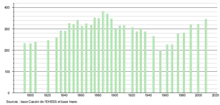 - ↑ Par convention dans Wikipédia, le principe a été retenu de n’afficher dans le tableau des recensements et le graphique, pour les populations légales postérieures à 1999, que les populations correspondant à une enquête exhaustive de recensement pour les communes de moins de 10 000 habitants, et que les populations des années 2006, 2011, 2016, etc. pour les communes de plus de 10 000 habitants, ainsi que la dernière population légale publiée par l’Insee pour l'ensemble des communes.