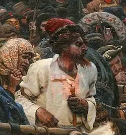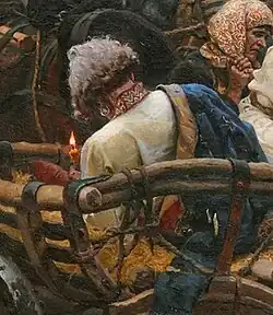 Le strelets aux cheveux clairs, allongé dans la télègue à gauche de la toile, tourne le dos, si bien que le spectateur ne voit pas son visage. L'expressivité du personnage est déterminée uniquement par la position de son corps[65]. Sa tête est penchée vers la flamme brulante de la bougie. Sur l'épaule droite, il porte un caftan usé, de couleur bleue, décoré de passementerie dorée en soie. Sous son caftan, il porte une kossovorotka, garnie d'un motif de couleur. À son oreille gauche pend une boucle en argent suivant la mode cosaque. Tout cela montre qu'il vivait, il n'y a pas si longtemps, dans l'aisance et portait des vêtements nouveaux et élégants. Mais ces dernières années, comme beaucoup de streltsy, il s'est appauvri. En décrivant de tels détails, Sourikov montre la situation désastreuse dans laquelle se trouvaient les streltsy avant leur mutinerie[119].
