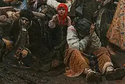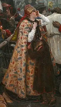 La jeune femme du strelets, qui vient d'être emmené vers le lieu d'exécution, exprime sa souffrance et son chagrin par un cri de désespoir. D'une main, elle prend le bord de son letnik et porte l'autre main à la tempe. Son cri est celui des pleureuses de l'ancienne coutume russe. Dans Journal d'un voyage en Moscovie, Johann George Korb écrit : « L'horreur de la mort imminente renforçait les cris de pitié des femmes » ; quand les streltsy sont arrachés à leur famille et sont conduits au lieu d'exécution, « les sanglots et les cris des femmes se font plus fort », elles demandent : « Pourquoi t'arrache-t-on à moi aussi vite ? Pourquoi me quittes-tu ? Je ne peux pas t'embrasser une dernière fois ? Ils ne nous laissent pas faire nos adieux ». On peut lire de tels détails dans le Journal de Kobra[65]. Sur le tableau, un fils se blottit contre la femme du strelets (streltchikha). Derrière lui, traine dans la boue un caftan couleur bordeaux et le chapeau de son père emmené vers les potences.
