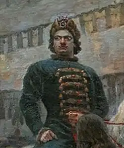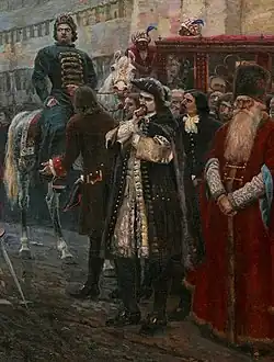 Les streltsy forment la première armée régulière en Russie. Cette armée est créée en 1550 sous Ivan le Terrible. Ses membres sont recrutés parmi les habitants corvéables des villes et des campagnes, puis leur service devient viager et héréditaire. Ils vivent dans des slobodas particulières et reçoivent un salaire en argent et en nourriture de la part de l'État. Les difficultés de leur métier, les retards dans le paiement des salaires, les abus des autorités provoquent le mécontentement des streltsy, qui conduit parfois à des soulèvements et parfois même à des émeutes telles que celles des années 1682 et 1698[97],[98]. La révolte des streltsy de 1698 est initiée par quatre régiments moscovites de l'armée des streltsy, qui ont pris part aux campagnes d'Azov, puis ont repris du service à la frontière occidentale de l'État. Au printemps 1698, lorsque Pierre le Grand voyage avec sa Grande Ambassade en Europe, 175 streltsy ont adressé une requête à Moscou pour que leur paie leur soit versée. Puis leurs revendications deviennent politiques : ils ont l'intention de placer sur le trône Alexis Petrovitch de Russie avec comme régente Sophie Alexeïevna. Les régiments de streltsy se dirigent déjà vers Moscou, mais, le 18 juin 1698 ( dans le calendrier grégorien), ils sont vaincus par les troupes gouvernementales lors d'un affrontement au monastère de la Nouvelle Jérusalem. L'enquête sur l'émeute des streltsy est menée en plusieurs étapes, et Pierre le Grand revient d'urgence de son voyage en Europe occidentale. Les exécutions des streltsy débutent à l'automne 1698 et font 1 300 victimes parmi les insurgés[99].