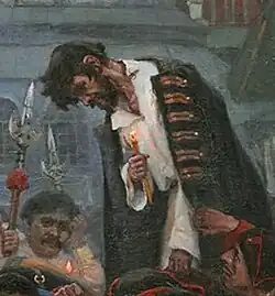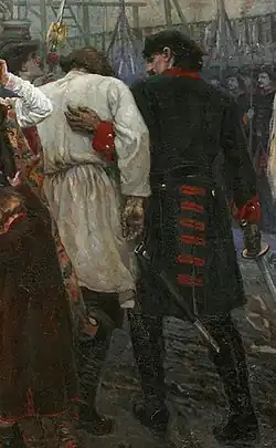 Le strelets à barbe noire est assis dans un chariot et tient une bougie allumée dans la main. À sa gauche, sa vieille mère, tenant un mouchoir devant sa figure, essuie les larmes qui lui coulent sur le visage. À droite, sa femme se distingue par son habillement jaune vif. Le strelets est plongé dans ses pensées et ne remarque pas la souffrance de ses proches qui l'entourent. Entre son visage et celui de son épouse, apparaît le visage d'un soldat, comme transfiguré par le drame qui se joue. Les jambes du strelets sont encore enchaînées, mais un autre soldat est occupé à ouvrir un cadenas avec une clé. Il semble donc qu'il sera bientôt conduit à l'échafaud[127],[122]. Ce strelets est « l'image d'un homme obstiné et volontaire, dans lequel on retrouve quelque chose d'un brigand dont la force intérieure n'est pas brisée par les évènements »[65].