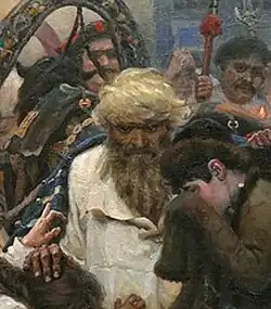Vladimir Kemenov considère qu'il serait erroné de croire que l'image de ce strelets exprime « une soumission tremblante » et « la vénération devant la force puissante du destin » (exprimée par la figure de Pierre le Grand), ou encore « une soumission fataliste à ce destin »[138]. Selon Kemenov, il n'y a dans l'inclinaison du corps du strelets qui fait ses adieux ni humilité devant le tsar, ni une « faiblesse d'esprit ». Le strelets demande pardon pour ses péchés non pas à Pierre Ier, à qui il tourne le dos, mais au peuple. Kemenov poursuit : « L'image du strelets qui s'incline est une heureuse réussite pour Vassili Sourikov. Elle est très importante dans la composition émotionnelle du tableau par rapport à la foule ; elle est la note indispensable qui résonne au milieu du chœur de toutes les souffrances du peuple »[65].