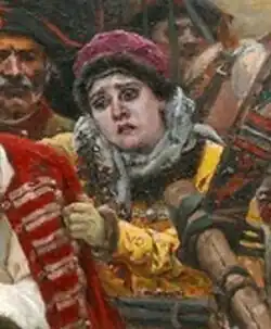 La femme du strelets à barbe noire se trouve à droite de son mari assis sur la télègue. Elle porte des vêtements jaune vif, un châle brodé gris et un chapeau couleur lilas. Elle prend l'épaule de son mari et la manche du caftan rouge pour l'aider à l'enlever. Son visage est pâle, marqué par la souffrance, ses sourcils sont tirés, « ses yeux sont grand ouverts et figés de douleur ». Elle regarde en vain vers son mari, attendant un mot ou un regard d'adieu, mais le strelets dans ces derniers instants est plongé dans ses pensées et dans sa colère, et il ne remarque pas les souffrances de sa femme[140].