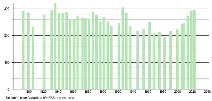 L'évolution du nombre d'habitants est connue à travers les recensements de la population effectués dans la commune depuis 1793. Pour les communes de moins de 10 000 habitants, une enquête de recensement portant sur toute la population est réalisée tous les cinq ans, les populations de référence des années intermédiaires étant quant à elles estimées par interpolation ou extrapolation[22]. Pour la commune, le premier recensement exhaustif entrant dans le cadre du nouveau dispositif a été réalisé en 2008[23].