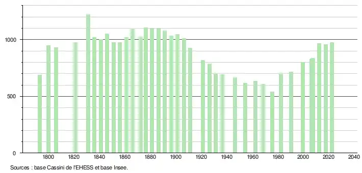 L'évolution du nombre d'habitants est connue à travers les recensements de la population effectués dans la commune depuis 1793. Pour les communes de moins de 10 000 habitants, une enquête de recensement portant sur toute la population est réalisée tous les cinq ans, les populations de référence des années intermédiaires étant quant à elles estimées par interpolation ou extrapolation[18]. Pour la commune, le premier recensement exhaustif entrant dans le cadre du nouveau dispositif a été réalisé en 2007[19].