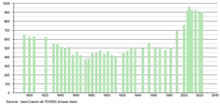 L'évolution du nombre d'habitants est connue à travers les recensements de la population effectués dans la commune depuis 1793. Pour les communes de moins de 10 000 habitants, une enquête de recensement portant sur toute la population est réalisée tous les cinq ans, les populations de référence des années intermédiaires étant quant à elles estimées par interpolation ou extrapolation[27]. Pour la commune, le premier recensement exhaustif entrant dans le cadre du nouveau dispositif a été réalisé en 2004[28].