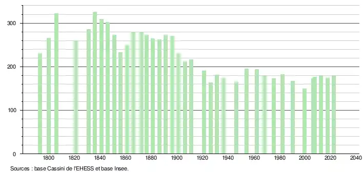 L'évolution du nombre d'habitants est connue à travers les recensements de la population effectués dans la commune depuis 1793. Pour les communes de moins de 10 000 habitants, une enquête de recensement portant sur toute la population est réalisée tous les cinq ans, les populations de référence des années intermédiaires étant quant à elles estimées par interpolation ou extrapolation[26]. Pour la commune, le premier recensement exhaustif entrant dans le cadre du nouveau dispositif a été réalisé en 2007[27].