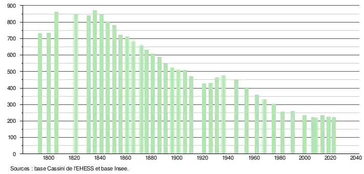 L'évolution du nombre d'habitants est connue à travers les recensements de la population effectués dans la commune depuis 1793. Pour les communes de moins de 10 000 habitants, une enquête de recensement portant sur toute la population est réalisée tous les cinq ans, les populations de référence des années intermédiaires étant quant à elles estimées par interpolation ou extrapolation[37]. Pour la commune, le premier recensement exhaustif entrant dans le cadre du nouveau dispositif a été réalisé en 2008[38].