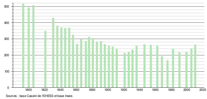 - ↑ Dans le tableau des recensements et le graphique, par convention dans Wikipédia, le principe a été retenu, pour les populations légales postérieures à 1999 de n’afficher dans le tableau des recensements et le graphique que les populations correspondant à l'année 2006, première population légale publiée calculée conformément aux concepts définis dans le décret no 2003-485 du 5 juin 2003, et les années correspondant à une enquête exhaustive de recensement pour les communes de moins de 10 000 habitants, ainsi que la dernière population légale publiée par l’Insee.