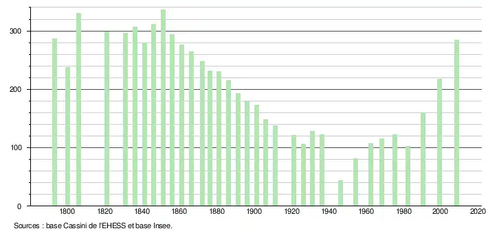 - ↑ Par convention dans Wikipédia, le principe a été retenu de n’afficher dans le tableau des recensements et le graphique, pour les populations légales postérieures à 1999, que les populations correspondant à une enquête exhaustive de recensement pour les communes de moins de 10 000 habitants, et que les populations des années 2006, 2011, 2016, etc. pour les communes de plus de 10 000 habitants, ainsi que la dernière population légale publiée par l’Insee pour l'ensemble des communes.