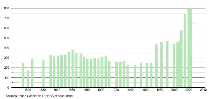 L'évolution du nombre d'habitants est connue à travers les recensements de la population effectués dans la commune depuis 1793. Pour les communes de moins de 10 000 habitants, une enquête de recensement portant sur toute la population est réalisée tous les cinq ans, les populations de référence des années intermédiaires étant quant à elles estimées par interpolation ou extrapolation[19]. Pour la commune, le premier recensement exhaustif entrant dans le cadre du nouveau dispositif a été réalisé en 2004[20].