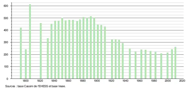 L'évolution du nombre d'habitants est connue à travers les recensements de la population effectués dans la commune depuis 1793. À partir du , les populations légales des communes sont publiées annuellement dans le cadre d'un recensement qui repose désormais sur une collecte d'information annuelle, concernant successivement tous les territoires communaux au cours d'une période de cinq ans. Pour les communes de moins de 10 000 habitants, une enquête de recensement portant sur toute la population est réalisée tous les cinq ans, les populations légales des années intermédiaires étant quant à elles estimées par interpolation ou extrapolation[14]. Pour la commune, le premier recensement exhaustif entrant dans le cadre du nouveau dispositif a été réalisé en 2005[15],[Note 2].