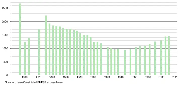 L'évolution du nombre d'habitants est connue à travers les recensements de la population effectués dans la commune depuis 1793. À partir du , les populations légales des communes sont publiées annuellement dans le cadre d'un recensement qui repose désormais sur une collecte d'information annuelle, concernant successivement tous les territoires communaux au cours d'une période de cinq ans. Pour les communes de moins de 10 000 habitants, une enquête de recensement portant sur toute la population est réalisée tous les cinq ans, les populations légales des années intermédiaires étant quant à elles estimées par interpolation ou extrapolation[10]. Pour la commune, le premier recensement exhaustif entrant dans le cadre du nouveau dispositif a été réalisé en 2005[11],[Note 1].