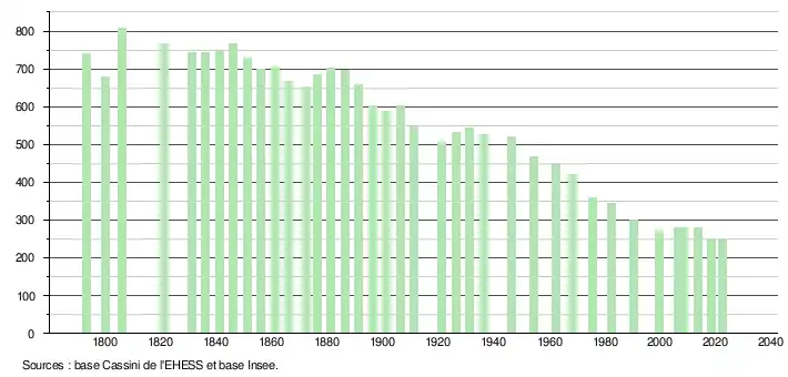 L'évolution du nombre d'habitants est connue à travers les recensements de la population effectués dans la commune depuis 1793. Pour les communes de moins de 10 000 habitants, une enquête de recensement portant sur toute la population est réalisée tous les cinq ans, les populations de référence des années intermédiaires étant quant à elles estimées par interpolation ou extrapolation[29]. Pour la commune, le premier recensement exhaustif entrant dans le cadre du nouveau dispositif a été réalisé en 2008[30].