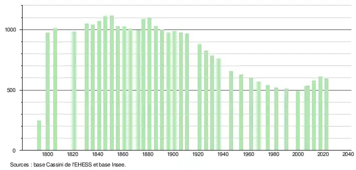 L'évolution du nombre d'habitants est connue à travers les recensements de la population effectués dans la commune depuis 1793. Pour les communes de moins de 10 000 habitants, une enquête de recensement portant sur toute la population est réalisée tous les cinq ans, les populations de référence des années intermédiaires étant quant à elles estimées par interpolation ou extrapolation[17]. Pour la commune, le premier recensement exhaustif entrant dans le cadre du nouveau dispositif a été réalisé en 2007[18].