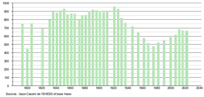 L'évolution du nombre d'habitants est connue à travers les recensements de la population effectués dans la commune depuis 1793. Pour les communes de moins de 10 000 habitants, une enquête de recensement portant sur toute la population est réalisée tous les cinq ans, les populations de référence des années intermédiaires étant quant à elles estimées par interpolation ou extrapolation[31]. Pour la commune, le premier recensement exhaustif entrant dans le cadre du nouveau dispositif a été réalisé en 2006[32].