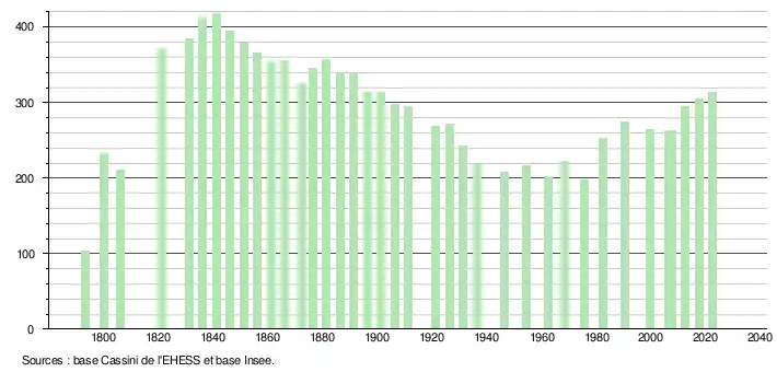 L'évolution du nombre d'habitants est connue à travers les recensements de la population effectués dans la commune depuis 1793. Pour les communes de moins de 10 000 habitants, une enquête de recensement portant sur toute la population est réalisée tous les cinq ans, les populations de référence des années intermédiaires étant quant à elles estimées par interpolation ou extrapolation[18]. Pour la commune, le premier recensement exhaustif entrant dans le cadre du nouveau dispositif a été réalisé en 2007[19].