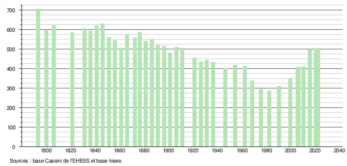 L'évolution du nombre d'habitants est connue à travers les recensements de la population effectués dans la commune depuis 1793. Pour les communes de moins de 10 000 habitants, une enquête de recensement portant sur toute la population est réalisée tous les cinq ans, les populations de référence des années intermédiaires étant quant à elles estimées par interpolation ou extrapolation[30]. Pour la commune, le premier recensement exhaustif entrant dans le cadre du nouveau dispositif a été réalisé en 2005[31].