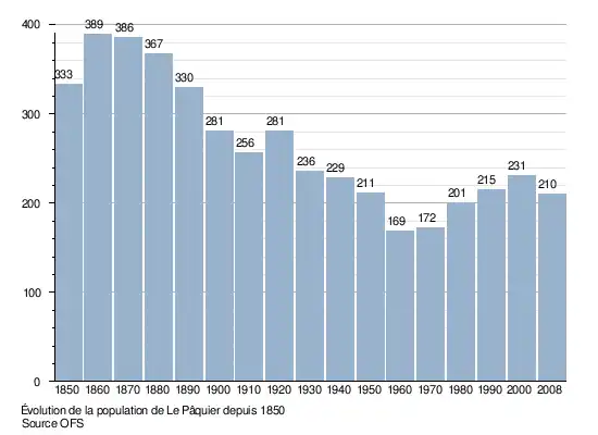 Le graphique suivant résume l'évolution de la population de Le Pâquier entre 1850 et 2008[3] :