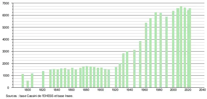 L'évolution du nombre d'habitants est connue à travers les recensements de la population effectués dans la commune depuis 1793. Pour les communes de moins de 10 000 habitants, une enquête de recensement portant sur toute la population est réalisée tous les cinq ans, les populations de référence des années intermédiaires étant quant à elles estimées par interpolation ou extrapolation[16]. Pour la commune, le premier recensement exhaustif entrant dans le cadre du nouveau dispositif a été réalisé en 2005[17].