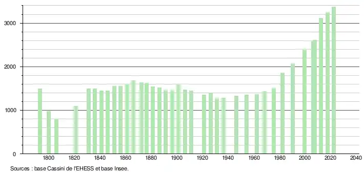 L'évolution du nombre d'habitants est connue à travers les recensements de la population effectués dans la commune depuis 1793. Pour les communes de moins de 10000habitants, une enquête de recensement portant sur toute la population est réalisée tous les cinqans, les populations de référence des années intermédiaires étant quant à elles estimées par interpolation ou extrapolation[37]. Pour la commune, le premier recensement exhaustif entrant dans le cadre du nouveau dispositif a été réalisé en 2007[38].