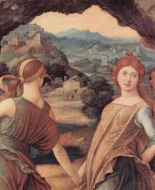 Le thème mythologique du Parnasse, lieu des amours adultères de Mars et Vénus, serait celui de l'épanouissement des arts représenté par Apollon et les Muses sous la bienveillance de Vénus (Isabelle d'Este) et de Francesco Gonzague (Mars).