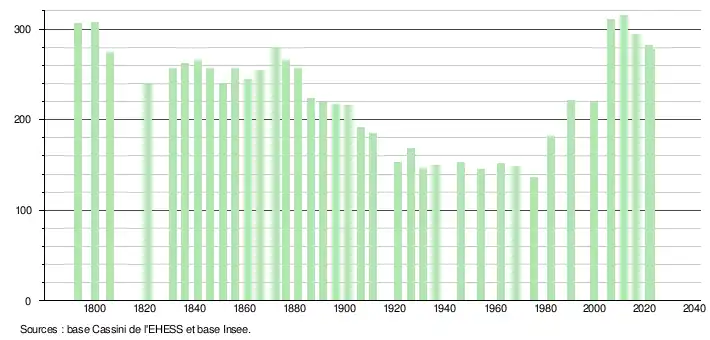 L'évolution du nombre d'habitants est connue à travers les recensements de la population effectués dans la commune depuis 1793. Pour les communes de moins de 10 000 habitants, une enquête de recensement portant sur toute la population est réalisée tous les cinq ans, les populations de référence des années intermédiaires étant quant à elles estimées par interpolation ou extrapolation[23]. Pour la commune, le premier recensement exhaustif entrant dans le cadre du nouveau dispositif a été réalisé en 2006[24].