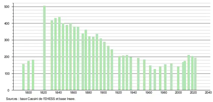 L'évolution du nombre d'habitants est connue à travers les recensements de la population effectués dans la commune depuis 1793. Pour les communes de moins de 10 000 habitants, une enquête de recensement portant sur toute la population est réalisée tous les cinq ans, les populations de référence des années intermédiaires étant quant à elles estimées par interpolation ou extrapolation[28]. Pour la commune, le premier recensement exhaustif entrant dans le cadre du nouveau dispositif a été réalisé en 2008[29].