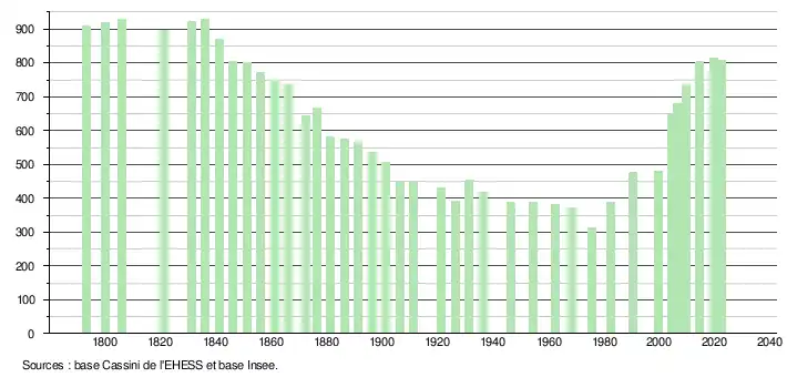 L'évolution du nombre d'habitants est connue à travers les recensements de la population effectués dans la commune depuis 1793. Pour les communes de moins de 10 000 habitants, une enquête de recensement portant sur toute la population est réalisée tous les cinq ans, les populations de référence des années intermédiaires étant quant à elles estimées par interpolation ou extrapolation[24]. Pour la commune, le premier recensement exhaustif entrant dans le cadre du nouveau dispositif a été réalisé en 2004[25].