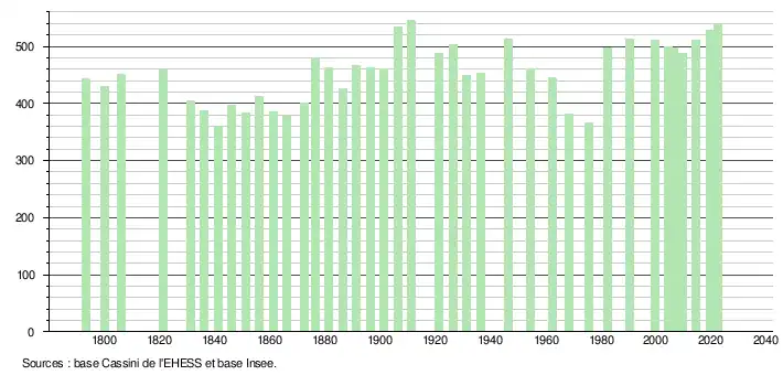 L'évolution du nombre d'habitants est connue à travers les recensements de la population effectués dans la commune depuis 1793. Pour les communes de moins de 10 000 habitants, une enquête de recensement portant sur toute la population est réalisée tous les cinq ans, les populations de référence des années intermédiaires étant quant à elles estimées par interpolation ou extrapolation[19]. Pour la commune, le premier recensement exhaustif entrant dans le cadre du nouveau dispositif a été réalisé en 2004[20].