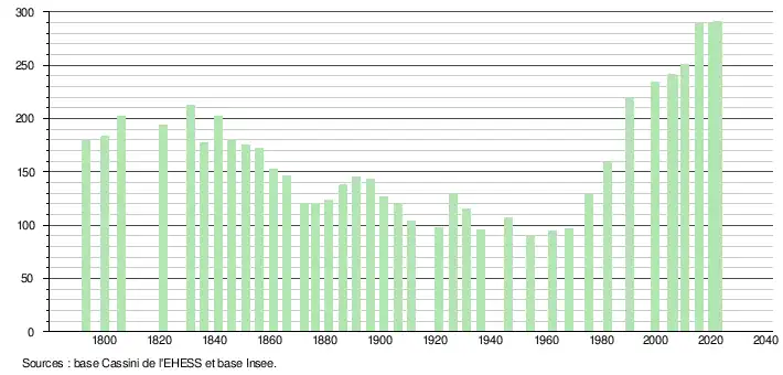 L'évolution du nombre d'habitants est connue à travers les recensements de la population effectués dans la commune depuis 1793. Pour les communes de moins de 10 000 habitants, une enquête de recensement portant sur toute la population est réalisée tous les cinq ans, les populations de référence des années intermédiaires étant quant à elles estimées par interpolation ou extrapolation[41]. Pour la commune, le premier recensement exhaustif entrant dans le cadre du nouveau dispositif a été réalisé en 2005[42].