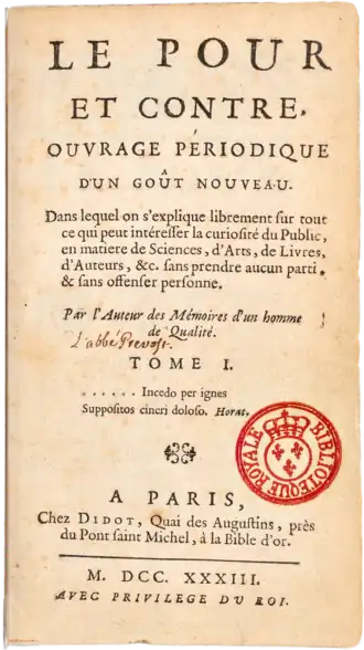 - ↑ Marie Rose de Labriolle, Le Pour et contre et son temps, t. 1, Genève, Institut et musée Voltaire, , 584 p., 2 vol. ; 23 cm (OCLC 13937402176979921, lire en ligne), p. 28.