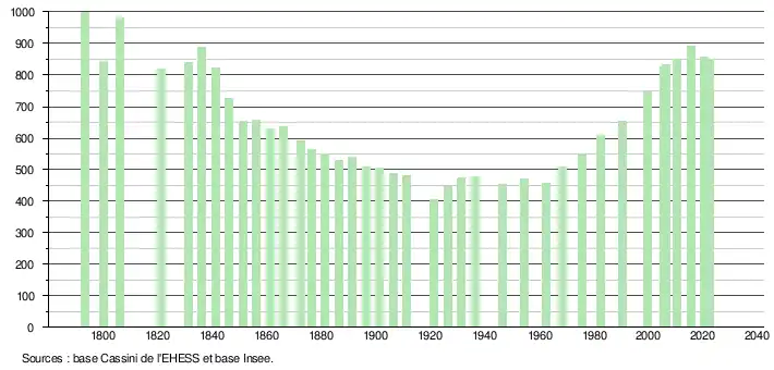 L'évolution du nombre d'habitants est connue à travers les recensements de la population effectués dans la commune depuis 1793. Pour les communes de moins de 10 000 habitants, une enquête de recensement portant sur toute la population est réalisée tous les cinq ans, les populations de référence des années intermédiaires étant quant à elles estimées par interpolation ou extrapolation[30]. Pour la commune, le premier recensement exhaustif entrant dans le cadre du nouveau dispositif a été réalisé en 2005[31].