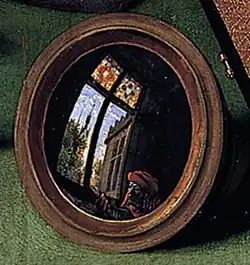 Si le tableau représente une scène d'intérieur, le miroir convexe, posé sur la table et orienté vers la gauche du spectateur, reflète une fenêtre à croisée qui s'ouvre vers l'extérieur. Les deux vitres supérieures représentent deux croix quadrilobées, rouge et bleue. Dans la vitre inférieure gauche, on distingue, se dressant au-dessus des arbres, la flèche gothique d'un beffroi, élément d'architecture typique de la Belgique et du Nord de la France. La forme élancée de celle-ci n'est d'ailleurs pas sans rappeler le beffroi ecclésiastique de la cathédrale Notre-Dame d'Anvers - sans cependant renvoyer exclusivement à ce dernier.