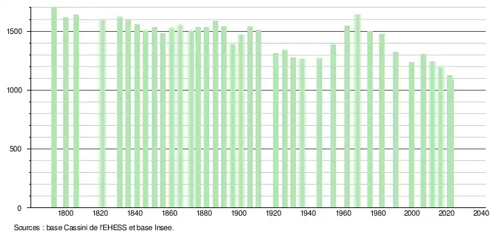 L'évolution du nombre d'habitants est connue à travers les recensements de la population effectués dans la commune depuis 1793. Pour les communes de moins de 10 000 habitants, une enquête de recensement portant sur toute la population est réalisée tous les cinq ans, les populations de référence des années intermédiaires étant quant à elles estimées par interpolation ou extrapolation[26]. Pour la commune, le premier recensement exhaustif entrant dans le cadre du nouveau dispositif a été réalisé en 2006[27].